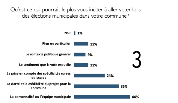 Enfin, l’étude s’intéresse aux éléments susceptibles d’inciter les électeurs à aller voter lors des municipales. Là encore, plusieurs réponses étaient possibles. Le facteur le plus cité est la personnalité ou l’équipe municipale, mentionné par 44% des répondants. La clarté et la crédibilité du projet pour la commune arrivent en deuxième position avec 35% de citations. La prise en compte des spécificités corses et locales est évoquée par 24% des personnes interrogées.