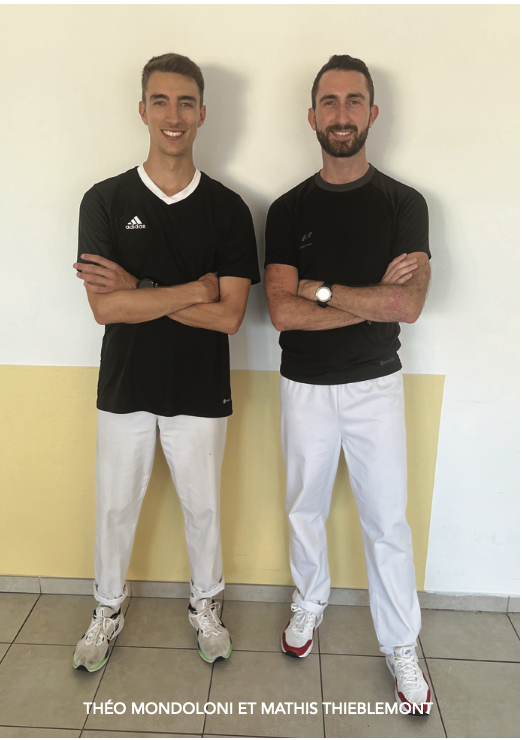 Tous deux formés à Grenoble, Théo Mondoloni et Mathis Thieblemont se rencontrent durant leur licence. Théo poursuit ensuite un master spécialisé dans la maladie chronique avant de revenir en Corse, où il exerce au centre de rééducation du Finosello, au sein du service cardio-respiratoire. Mathis choisit pour sa part un master à Lausanne, enrichi de stages en cardiologie, neurologie et psychiatrie, puis rejoint Théo en avril 2023 pour concrétiser leur projet associatif commun. En parallèle de Mouv’Santé Ajaccio, les deux professionnels interviennent également dans les services du centre de rééducation du Finosello : Théo au service cardio-respiratoire, Mathis au service d’addictologie et psychothérapie.